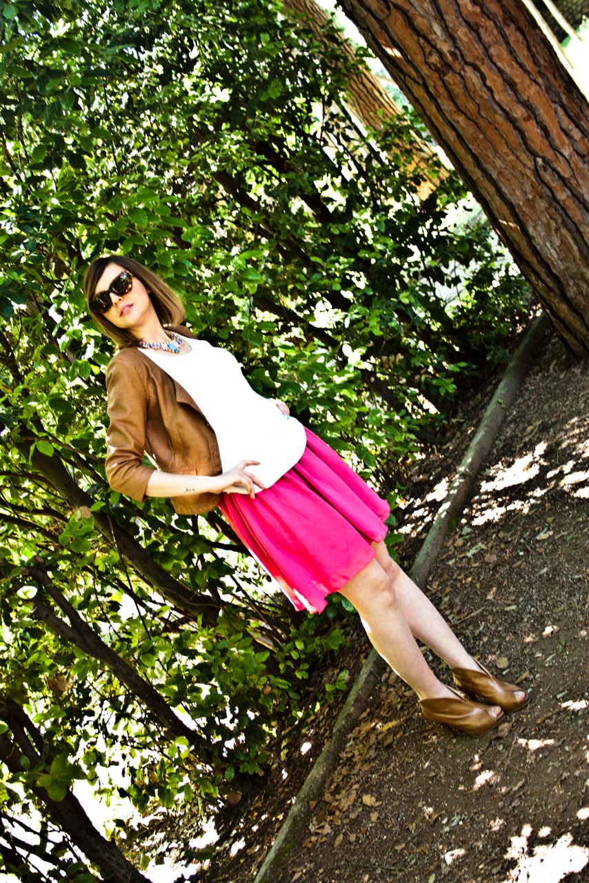 mi piace tutto di quest'outfit: l'abbinamento fucsia/cuoio, le scarpe, la giacca e ovviamente la gonna! perfetta
